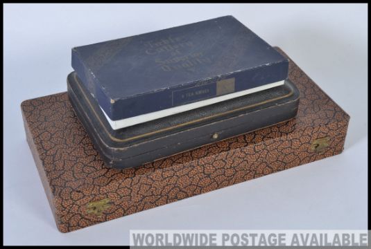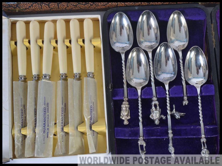 An unusual collection of silver plated character spoons in the original presentation case complete with other boxed flatwares