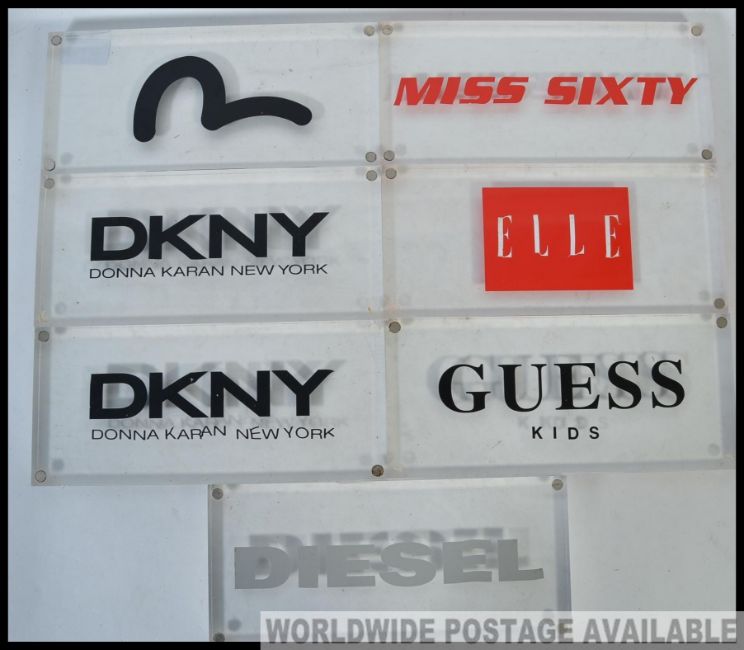 A collection of seven fashion house point of sales adverting blocks, being constructed from perspex, to include Diesel, DKNY, bELLE etc please see images L16cm