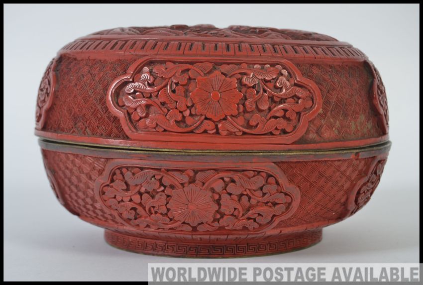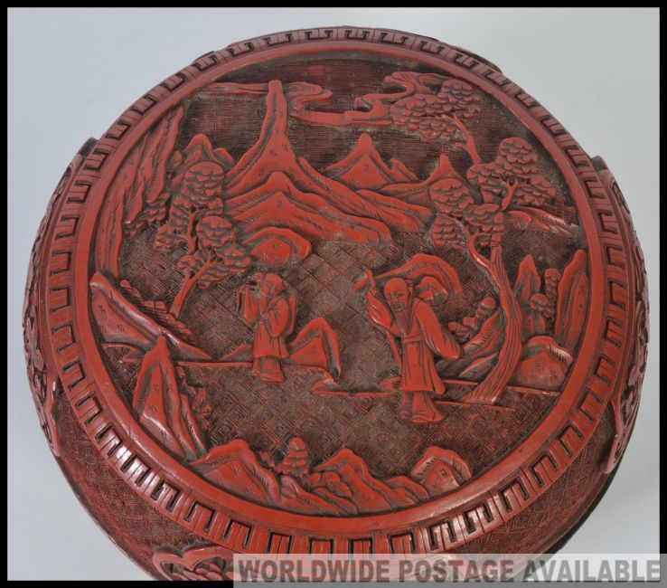A 19th century Chinese cinnabar lacquer circular box and cover, the cover carved with a figure standing before mountains and trees