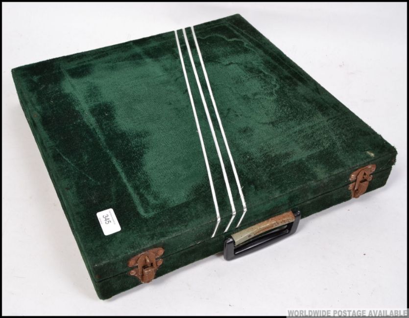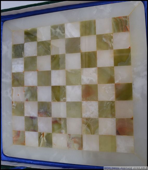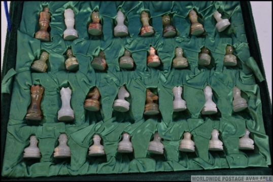 A 20th century velour cased chess set. Each piece being hand carved from onyx. Complete with the original onyx chess board.