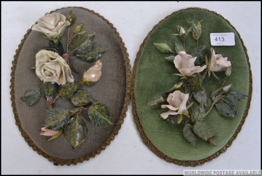 A pair of late 19th century wall hanging armorial shield velvet covered plaques with ceramic handmade floes attached
