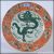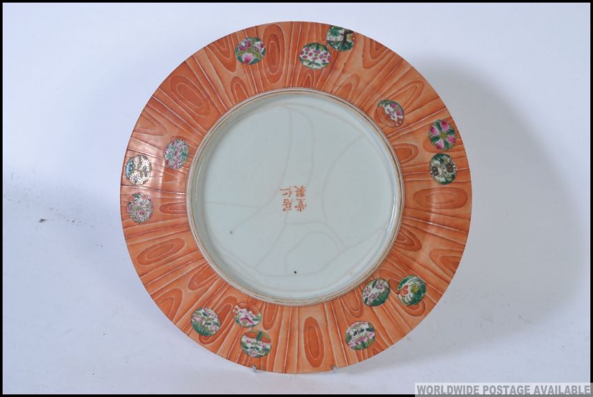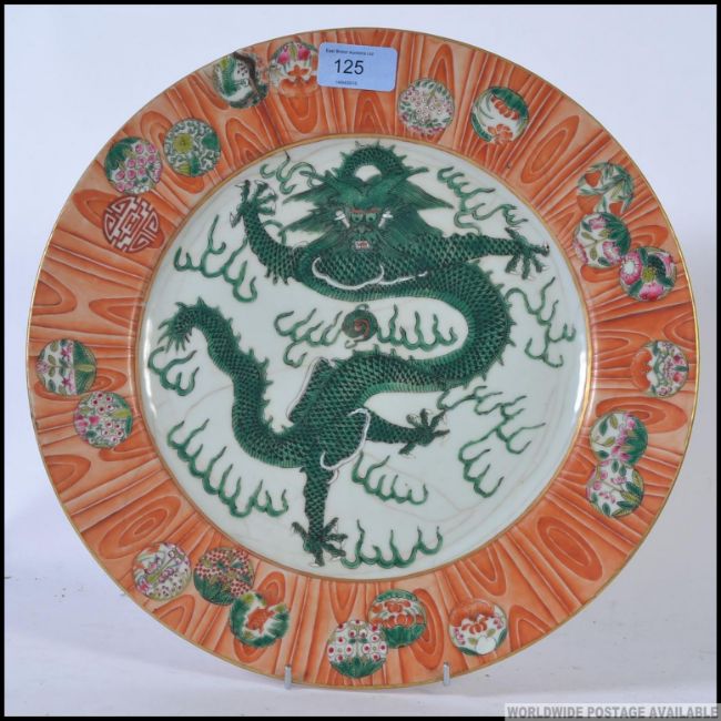 A Chinese charger / plate with central green 5 claw dragon, the outer borders with roundel cartouche panels stylised with floral motifs. The base with ochre red 4 character marks W32cm