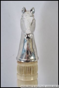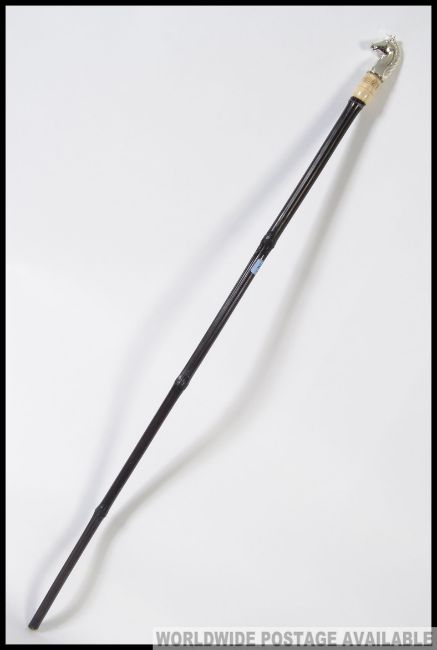 A 20th century gentleman`s cane having a silver metal horses head handle with an Ivory collar and ebonised shaft H92cm