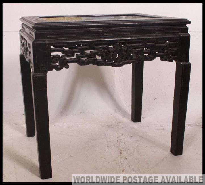 A 19th century Anglo - Chinese colonial ceramic and ebonised wood tray top table. The inset ceramic bowl with stunning handpainted still life of flowers being signed by the artist. Set to a fret pierced frieze frame with squared legs