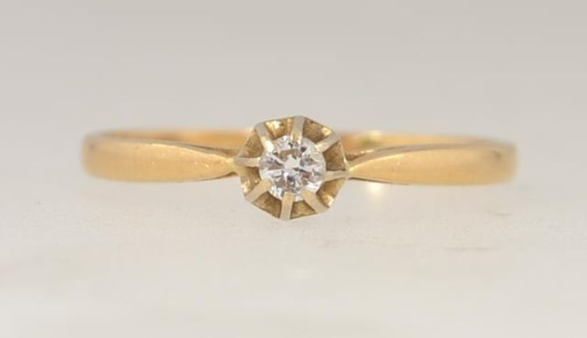 A vintage 18ct gold solitaire diamond ring with single 5pt diamond in a prong setting. Marked with tulip and 750 as well as 18ct. Tests 18ct. Size O. Weight 1.8g.
