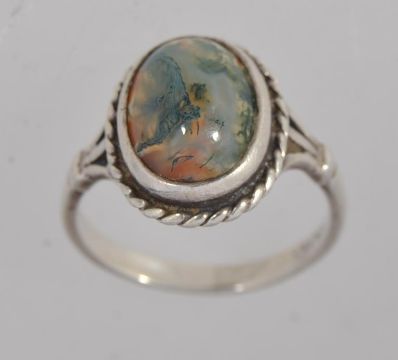 A 925 silver dress ring with central moss agate cabochon surrounded by a rope twist setting. Size M Weight 3g.