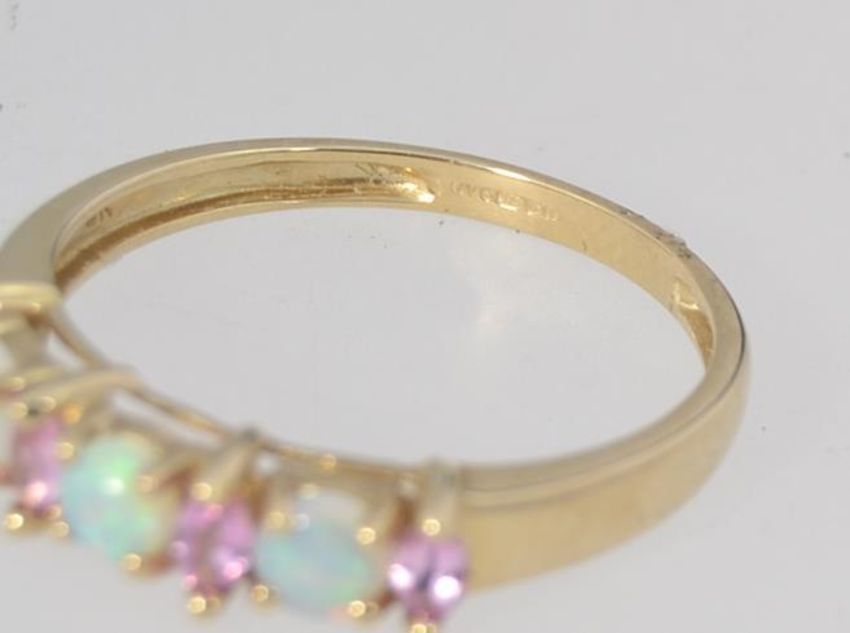 A hallmarked Birmingham 9ct gold ring set with opals and pink stones in a prong setting. Weight 2.4g. Size T.