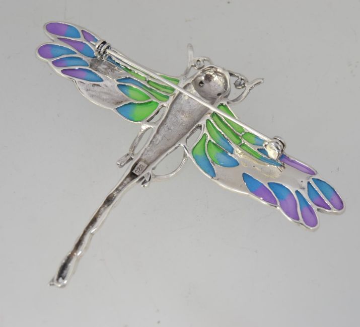 A large 925 silver plique a jour brooch in the form of a dragonfly with marcasite set body with emerald green stone eyes body and red cabochon head with roller clip clasp. Measures 4.5 cms.