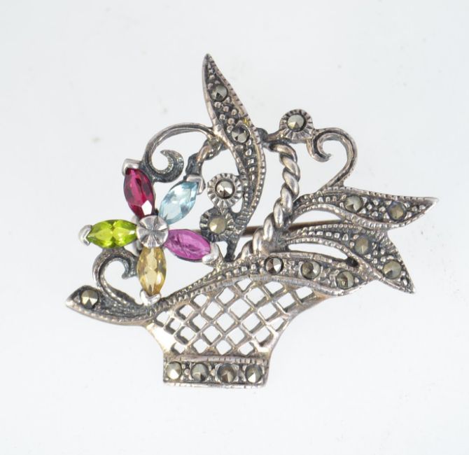 A vintage 925 silver brooch pin in the form of a posy basket with gemstone set flower and marcasite set foliates with roller clip clasp. Marked 925. Measures 3.5cms