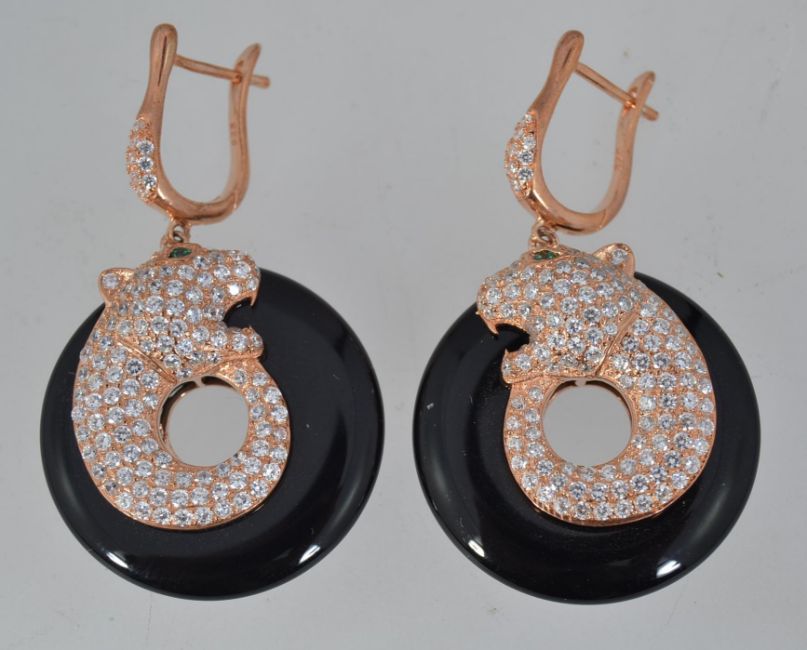 A pair of 925 designer silver gilt and onyx earings decorated with a panther encrusrted with CZ with emerald green eyes and clip post backs.
