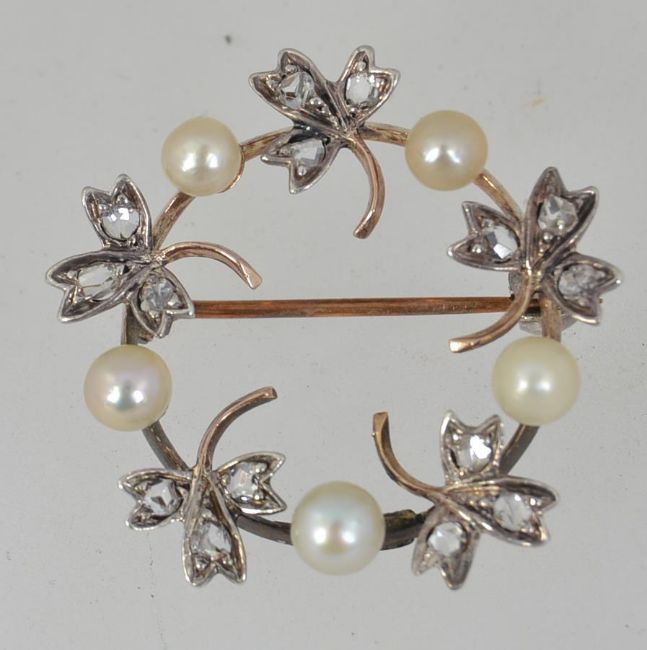 An Edwardian tested 9ct gold wreath brooch pin with clover leaves set with rose cut diamonds interspaced with pearls with roller clasp. Measures 3cms. Weight 3.9g.