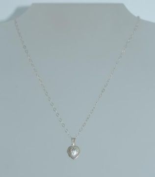 A 925 silver pendant necklace strung with a heart shape locked with foliate engraving on a silver chain. Marked 925. Measures 16 inches. Weight 1.9g