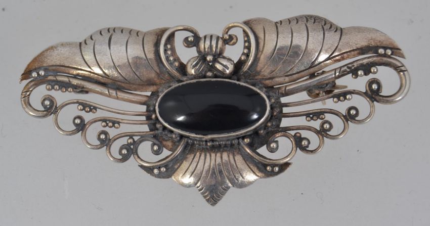 An 800 silver Art Nouveau brooch with onyx set cabouchon and roller clip clasp. Measures 6cms.