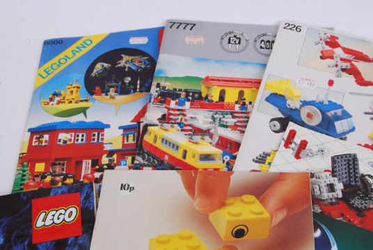 LEGO: A quantity of assorted vintage Lego instructions, catalogues and related pieces etc. Mostly 1980's - 1990's, some others. Including a few sheets of partially unused Lego decals. Rare.