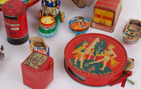 TINPLATE: A good selection of vintage tinplate models and toys to include a Chad Valley spinning top, a battery operated tinplate tank, Nully Secundis model gun, various clockwork pieces etc. Good assortment.