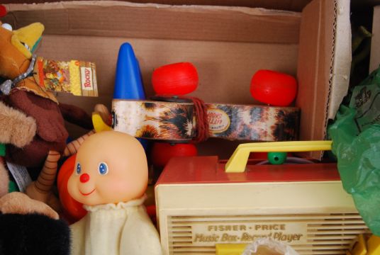 TOYS & GAMES: A collection of assorted vintage toys and games etc to include Fisher Price School, Fisher Price Record Player, RC Fisherman, Peter Rabbit soft toy, tupperware toys and others.