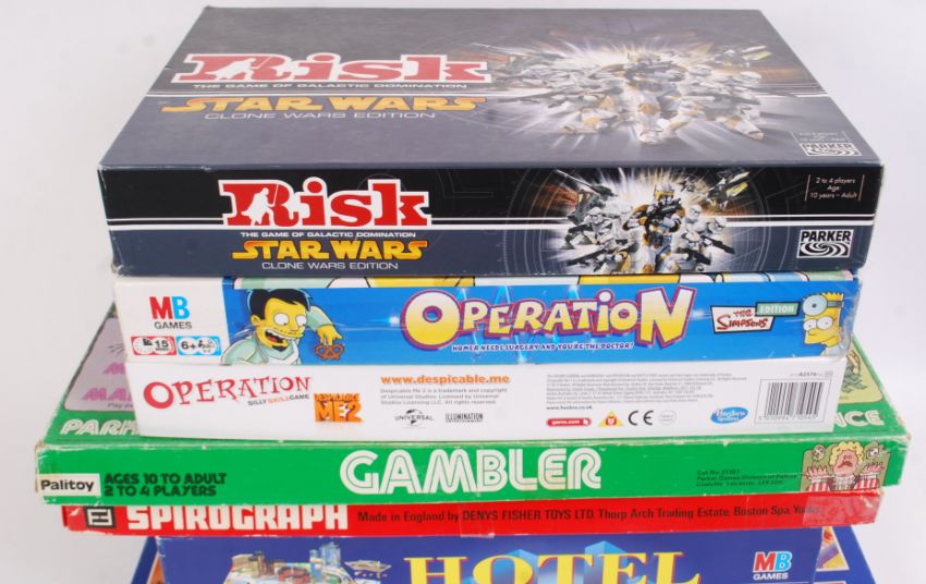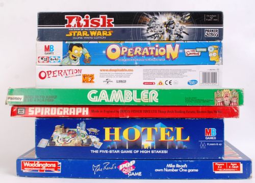 GAMES: A collection of assorted board games to include both vintage and contemporary: Star Wars Risk, Simpsons Operation, Hotel, Mike Read's Pub Quiz, Spirograph and others. x7 total.