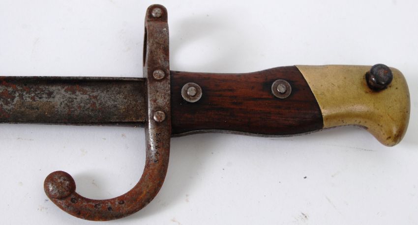 BAYONET: A c1886 French Gras military rifle short bayonet. Approx 50cm long. NOTE: From an impressive private collection of original bayonets - ranging from Victorian to Second World War. Collected by the vendor since late teens, this is the first time this collection has appeared on the market. Most bayonets are in generally good condition, and have been well cared for etc. Buyers are reminded to satisfy themselves as to individual condition of lots prior to bidding.
