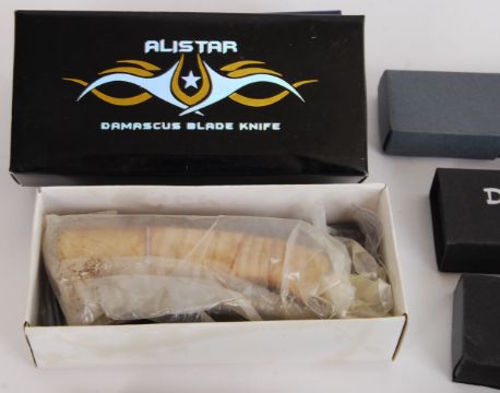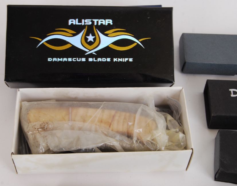 ALISTAR DAMASCUS: A collection of 13x Alistar Damascus Blade Knife knives. Each within the original boxes (some multiples in boxes). Varying sizes, each with a decorative handle and damascus blade. Some loose.