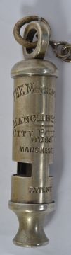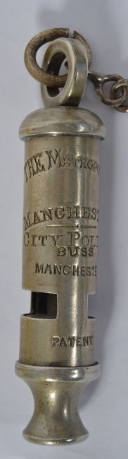 POLICE WHISTLE: An original Victorian / early 20th century Police ' Metropolitan ' uniform whistle, impressed with ' Manchester City Police ' No makers name, but likely to be by J. Hudson & Co. NOTE: From a private collection of vintage Policeman's whistles. Consigned from a private ex- Policeman collection's. Many are rare or hard to find examples, some possibly the only surviving whistles of such forces. All come with chain and hook and are in generally very good ' as used ' condition. A rare and unique collection.