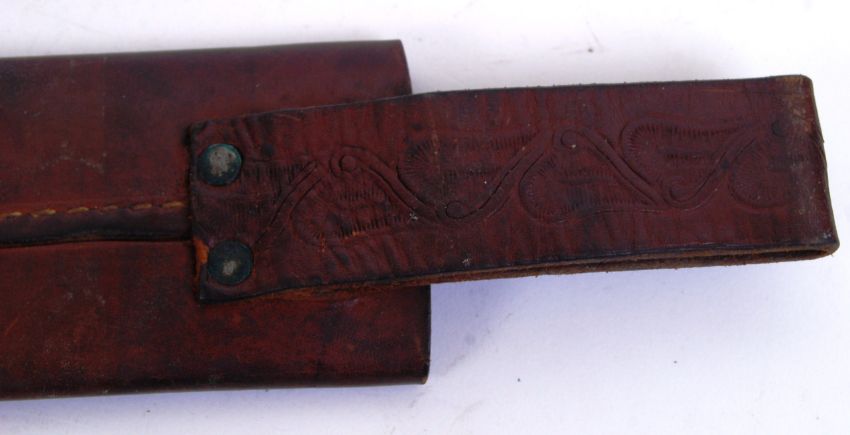 V44 KNIFE: A mid century WWII era US Rangers army issue V44 hunting Bowie knife, with 14" blade. In an original Collins & Co leather scabbard.