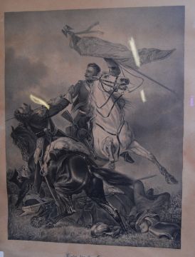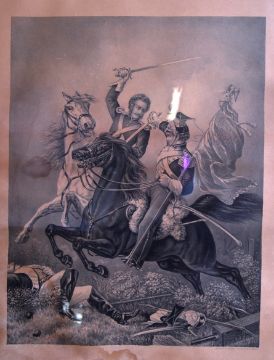 FIGHT FOR THE STANDARD: After Richard Ansdell (British, 1815-1885), 'The Fight for the Standard I and II'. Of Napoleonic interest, Sergeant Charles Ewart defending the seized standard on the French 45th regiment of the Line from a French lancer during the battle of Waterloo, 1815. Framed and glazed 80cm x 66cm.