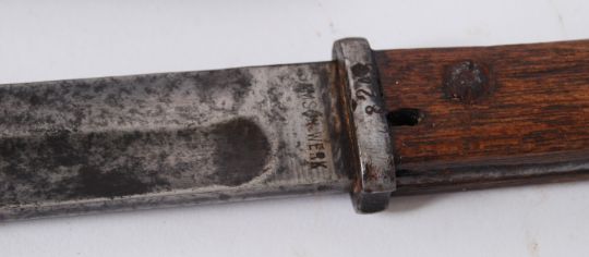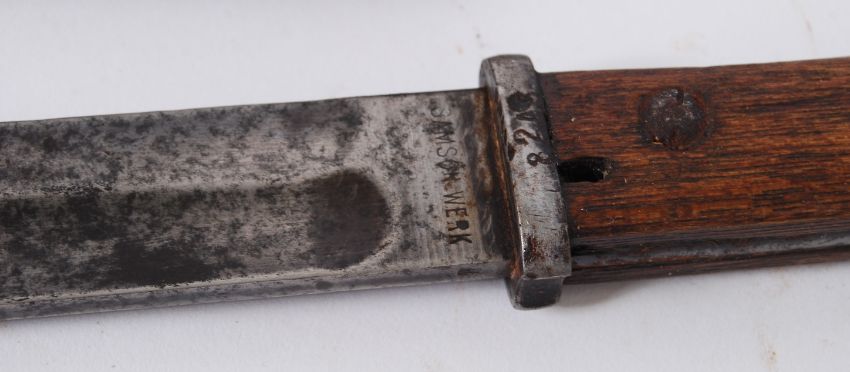 BAYONET: A First World War WWI German Samsen Werk marked rifle bayonet, with scabbard and original leather holster. 45cm long. NOTE: From an impressive private collection of original bayonets - ranging from Victorian to Second World War. Collected by the vendor since late teens, this is the first time this collection has appeared on the market. Most bayonets are in generally good condition, and have been well cared for etc. Buyers are reminded to satisfy themselves as to individual condition of lots prior to bidding.