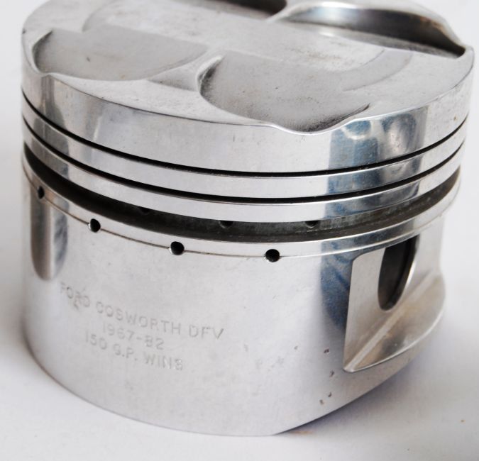 MOTORING MEMORABILIA: A collection of assorted vintage motoring memorabilia from the Frank Page collection (ex Top Gear presenter) to include a Ford Cosworth DFV 1967 - 1982 GP piston, a Maserati Williams F1 valve used during the 1981 Grand Prix Season, a piece of marble from Fanum House with brass AA Badge to centre, and a Gold Leaf Team Lotus 1968-70 wheel cap nut