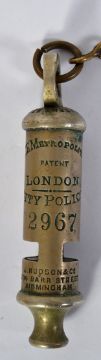 POLICE WHISTLE: An original Victorian / early 20th century Police ' Metropolitan ' uniform whistle, impressed with ' City Of London ' and numbered 2967 , relating to the officer who owned it. By J. Hudson & Co. NOTE: From a private collection of vintage Policeman's whistles. Consigned from a private ex- Policeman collection's. Many are rare or hard to find examples, some possibly the only surviving whistles of such forces. All come with chain and hook and are in generally very good ' as used ' condition. A rare and unique collection.