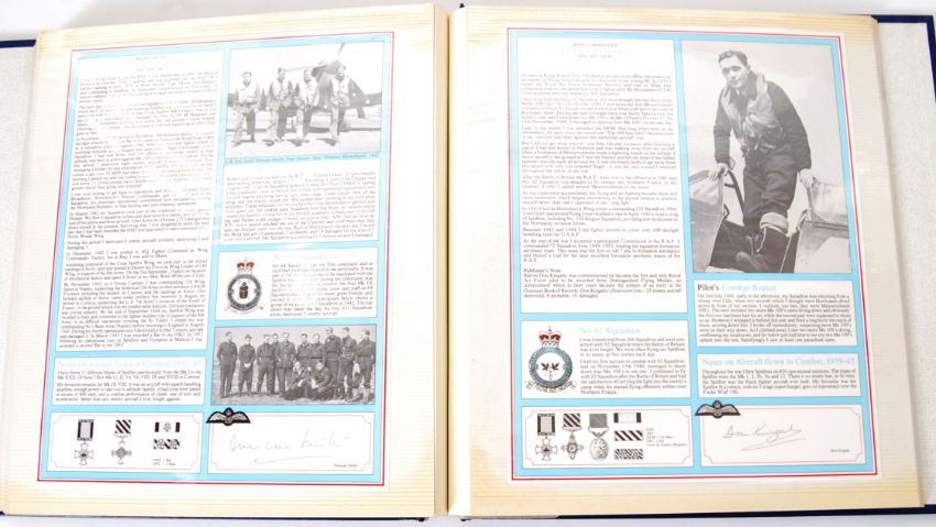 FIGHTER PILOT PROFILE COLLECTION: A fabulous presentation album based on the RAF Fighter Pilots during WWII. Entire album of fact sheets and medal details etc - each card being hand signed in pencil by the relevant pilot; All hand signed, apart from Douglas Bader which is printed. Issued by the Douglas Bader Foundation. Signatures include; Rod Smith, Duncan Smith, John Cunningham, John Waddy, Denys Gillam, Pete Brothers, Don Kingaby, Brian Kingcome, Johnnie Johnson, Alan Deere, Alan Smith, HM Stephen, Bob-Stanford Tuck, Chris Foxley-Norris, Dutch Hugo, Laddie Lucas, Bobby Ospring, Denis Crowley - Milling, David Scott-Malden, Nip Heppell, Peter Townsend, Paddy Barthopp, Frank Carey, Sandy Johnstone, Jamie Jameson, Hugh Dindas. Great collection.