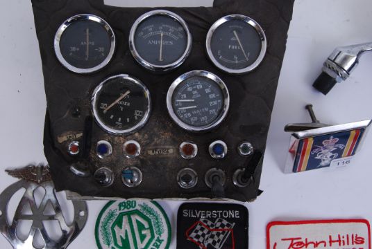CLASSIC CAR SPARES: A good collection of assorted vintage classic car spares, many early to include a 1970's chrome Desmo wing mirror, various Smiths gauges, centre console unit, Jaeger Oil & Fuel gauges, Smiths Car Clock and various motoring related patches. Good mixture.