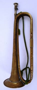 FIRST WORLD WAR TRUMPET: An original First World War WWI issue military trumpet. Brass construction, with original green sashing. Stamped for Boosey & Co and dated 1914. 44cm tall.