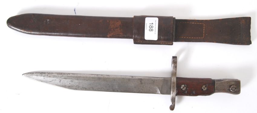 BAYONET: An Edwardian Canadian bayonet with leather scabbard, marked Ross Rifle Co., Quebec, patented 1907, length 37cm. Complete with leather scabbard. Various markings to hilt. NOTE: From an impressive private collection of original bayonets - ranging from Victorian to Second World War. Collected by the vendor since late teens, this is the first time this collection has appeared on the market. Most bayonets are in generally good condition, and have been well cared for etc. Buyers are reminded to satisfy themselves as to individual condition of lots prior to bidding.