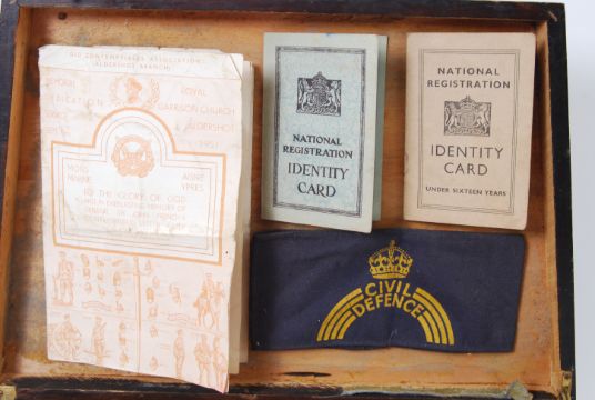 MILITARIA: A box of assorted militaria to include a Civil Defence armband in blue, a Bristol Constabulary police booklet, various cap badges, whistle and papers etc.