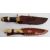 KNIVES: A pair of 20th century Damascus bladed hunting knives - both with horn or faux horn handles and brass caps to end. Both within the original leather scabbards.
