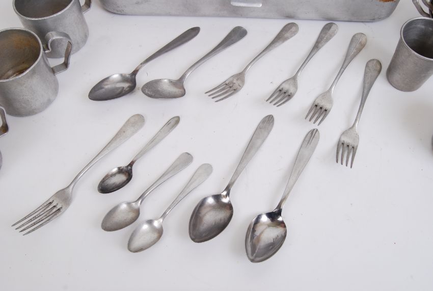 LUFTWAFFE CANTEEN: A rare second world war WWII issue Nazi airman / Luftwaffe food canteen. All lightweight aluminium in construction with various makers marks to each piece. More likely an accumulation of various canteens in one. Comprising of large holdall case with latch front, 5x aluminium cups made by Hagemann Belecke, 1x jug, 12x assorted spoons, forks etc (some marked with a Swastika, others with various markings etc. A rare collection of German army issued pieces.