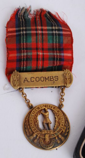 MEDALS: An interesting collection of items belonging to a A. Coombs 13116 C of E (Church Of England ). To include his original aluminium dog tag, 2x 1855 Caledonian medals and a 1938 Tug Of War medal. Interesting.