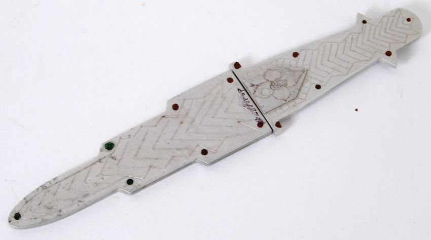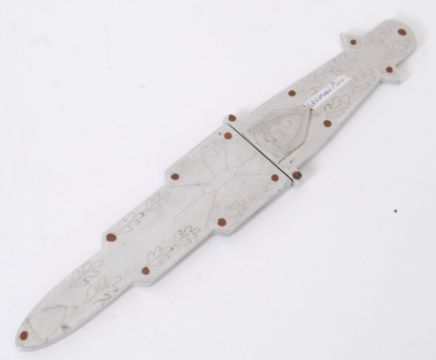 POW LETTER OPENEER: A rare believed German Prisoner Of War made dagger / letter opener. Likely from aluminium found from wrecked aircraft, the engraved alloy casing hiding a brass blade. Good engraving to outside.