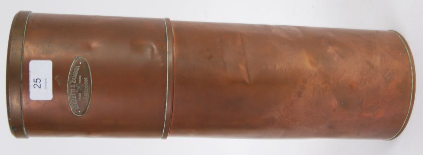 RAIN GAUGE; A copper rain gauge, first half 20th century, the gauge of cylinder form opening to reveal a clear bottle. Marked with a plaque for Negretti & Zambia of London.