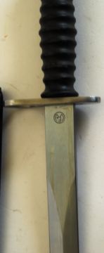 DAGGER: A 20th century Dutch Army bayonet dagger complete with composite scabbard. The shaped blade marked F+W with additional marks 525472. Approx 45cm long (with scabbard)