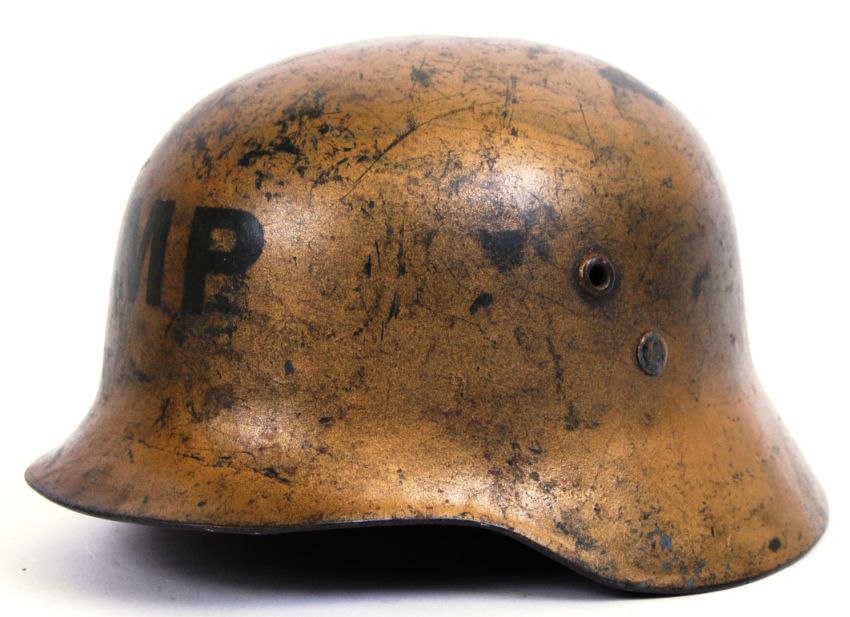 ROMANIAN HELMET: A rare Romanian steel MP Military Police helmet, in gold colouring. MP to front.