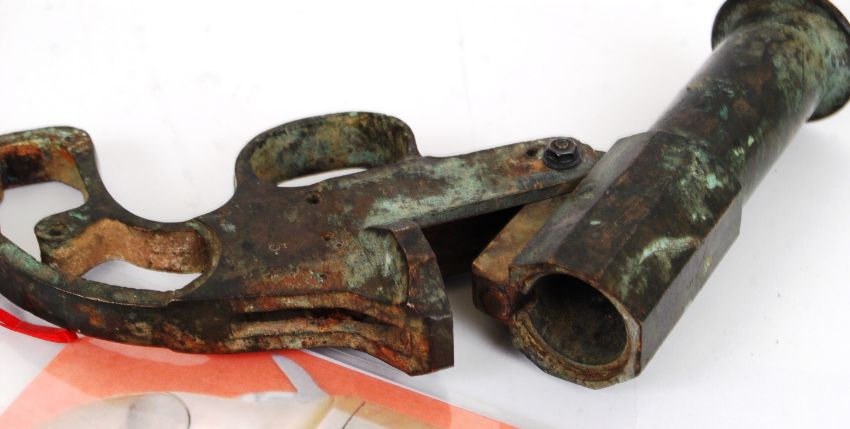 GERMAN ZEPPELIN FLARE GUN: An original German Imperial Navy flare pistol. Purportedly found in the River Ouse in the summer of 1968. A detailed tag attached to the pistol tells of how it is possibly from a Zeppelin that crashed up river during the First World War. Flare gun is AF.