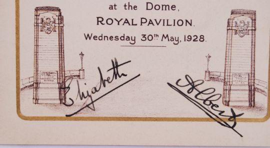 DUKE & DUCHESS OF YORK: A rare and unique vintage ' Greater Brighton Celebrations ' Wednesday 30th May 1928 Luncheon Menu, celebrating the ' Visit Of Their Royal Highness The Duke & Duchess Of York '. Signed to the front by Elizabeth Bowes - Lyon (later The Queen Mother) simply ' Elizabeth ' and her husband Prince Albert (later King George VI ), simply signed ' Albert .' Both autographs in the same fountain pen ink to a light portion of the front cover. 23cm x 15cm. Comes with a somewhat candid photograph, believed to be related, annotated ' The Two Queens (Mary & Elizabeth) With Curator Of Royal Pavilion.' Obtained personally by a relative of the vendor. Rare.