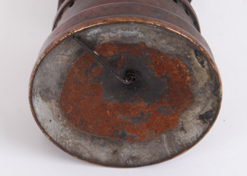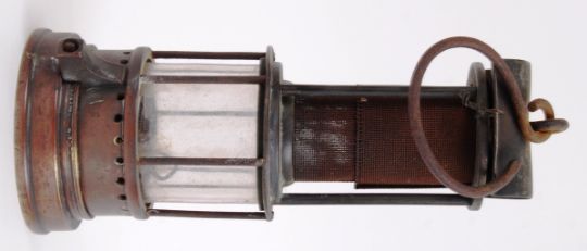 CLANNY LAMP: A rare 19th century miners Clanny Lamp. Brass, with circular top, with pierced vent holes, supported by three brass columns protecting copper gauze above a glass protected by four brass bars and a circular font, screw lock in the base, no manufacturer's mark/name. 23cm tall (excluding handle)