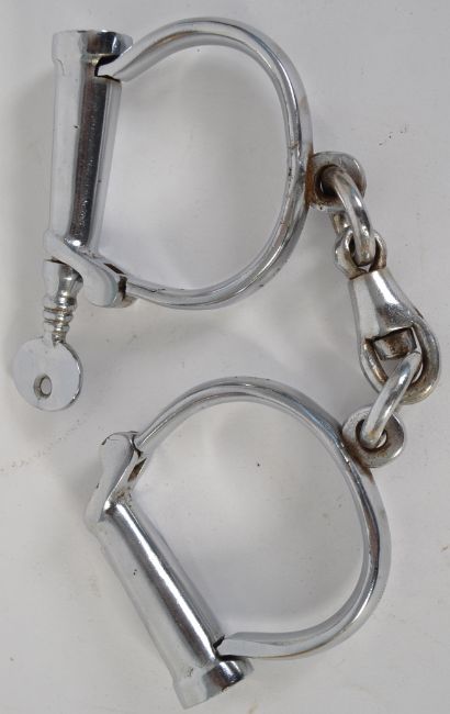 HANDCUFFS: An original pair of early 20th century Hiatt ' D ' policeman's handcuffs. Makers marks to side. With key. Working.