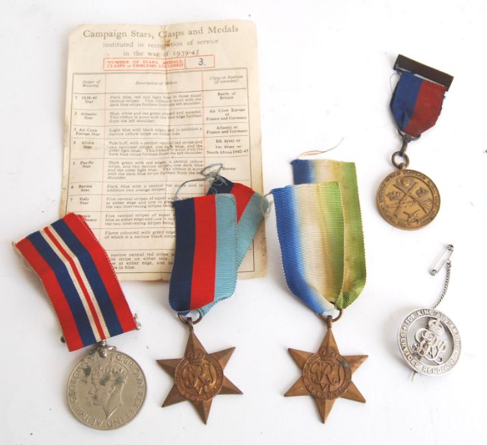 MEDALS: A collection of medals to include WWII Second World War Medal group to include, 39-45 Star, Atlantic Star and War Medal along with the associated card. Recipient unknown. Along with a shooting medal engraved ' Fairfax, 1928, For Services Rendered, and a badge engraved 344309. Not believed to be related to the medal group