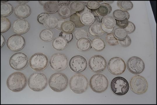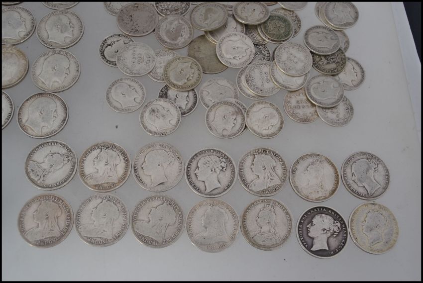 A good collection of silver coins to include 1 George IV 1626 shilling, 25 Edward VII shillings, 13 Victorian shillings dating from 1845 - 1900, 5 silver florin's dating from 1856 - 1911, 18 Victorian six pence dating from 1882 - 1900, 26 Edward VII six pence dating from 1902 - 1907, 7 George V three pence gating from 1911 - 1924 along with a few other silver coins.