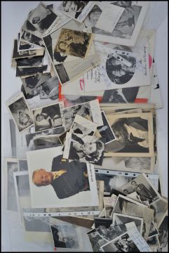 AUTOGRAPHS; A LARGE collection of autographs - mostly all pre-war entertainers, radio or stars of stage and screen. Some later. 150+ examples, mostly all hand signed, few printed. To include; Nat Jackley, John Inman, Frankie Vaughan, Nicholas Parsons, Gert & Daisy, Galdys Morgan, Stanley Black, Richard Hearn, KAy Cavendish, Harry Roy, Roy Barbour, John Hanson, Charlie Chester, Big Bill Campbell, Rex Harte & June, The Famous Kellinos, Joyce Golding, PAtricia Davies, Beryl Reid, Max Wall, Arthur English, Percy Edwards, Syd Seymour, The Mack Triplets, Jimmy Jewel & Ben Warriss, Freddie Sales, DOuglas Wakefield, Jack Clifford, Charlie Williams, Florena Desmond, Ester Ralston, Paula Grey, Pat Phoenix, Bill Johnson, Martin Shaw, The Five Smith Brothers, Wendy Richard, Virginia McKenna, The Spinners, Hinge & Bracket, Max Bygraves and many others. Various sizes.