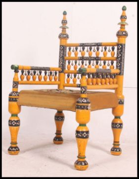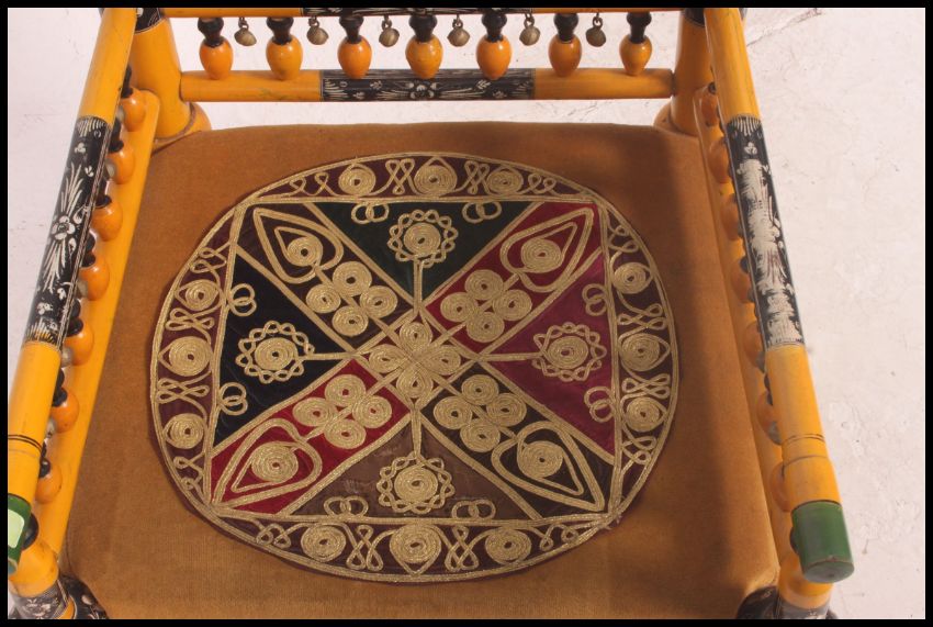 A stunning Indian handpainted yellow opium / hall chair raised on turned legs with overstuffed velour needlepoint seat and spindle gallery back rests having finial crowns. 96cms x 55cms x 53cms
