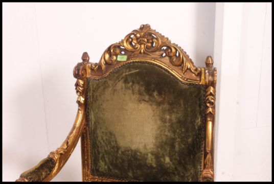 A pair of 19th century French gilded fauteuil / armchairs The gilt framed chairs being raised on turned legs with green velour seats and back rests with show gilt frame. Matching canape sofa in lot 1326